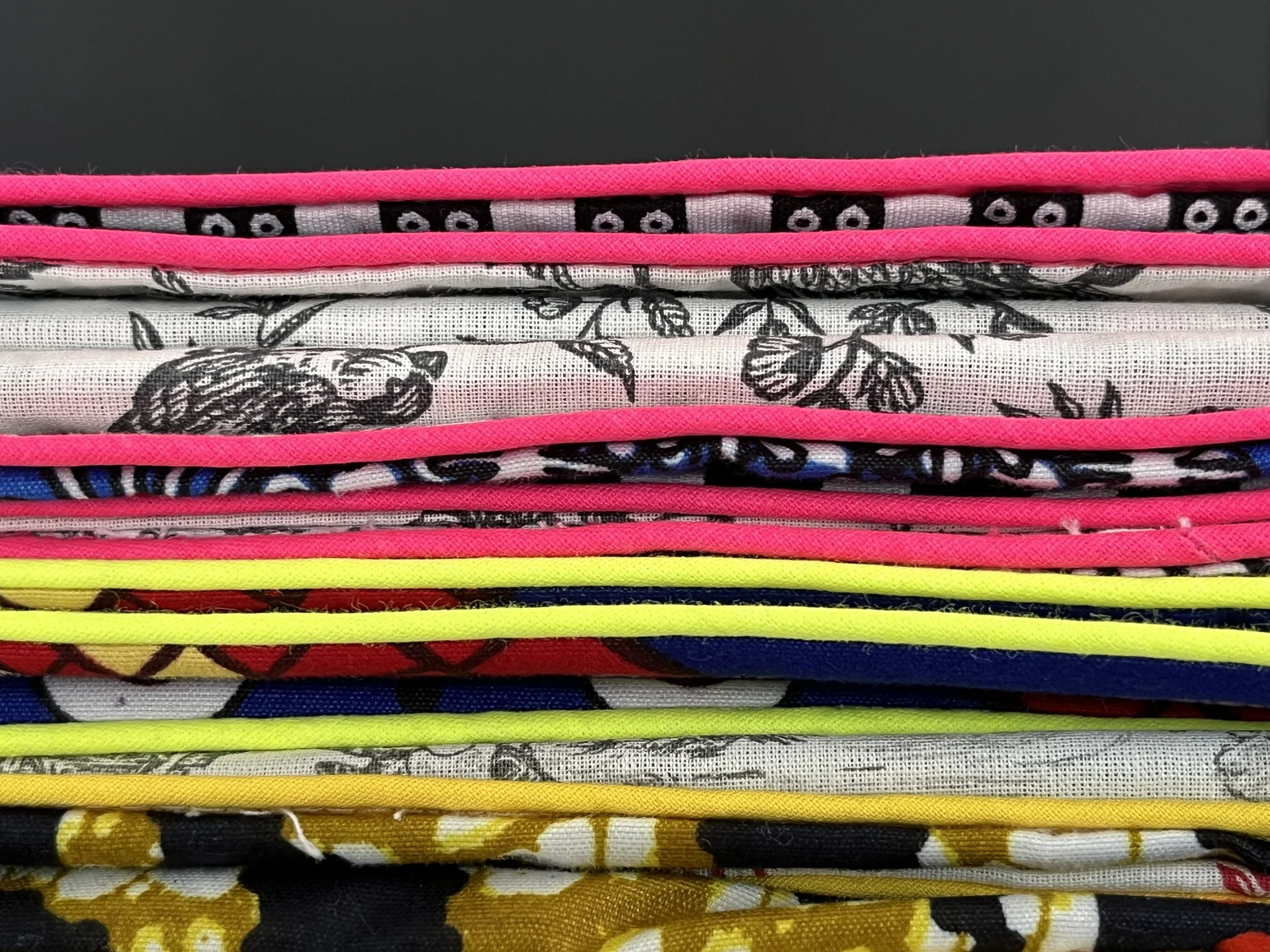 A l’issue de ce long cheminement, Il n’est donc pas très étrange, qu’un jour, en passant « en touriste » dans les allées du marché Saint-Pierre, j’ai soudainement éprouvé le besoin de mélanger de la toile de Jouy à des wax d’origines bien « opposés ». En passepoilant tout ça avec de la couleur, j’ai créé un premier « plaid ».